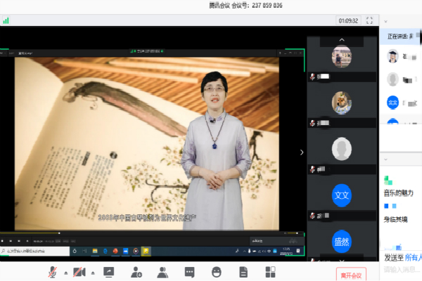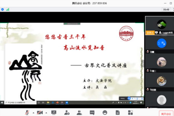 为让更多员工了解、喜爱古琴文化知识,在感受艺术之美中弘扬、传承中华传统文化,4月15日下午,公司“文韵讲堂”第二期“悠悠琴音三千年 高山流水觅知音”古琴文化普及讲座成功举行。讲座通过腾讯会议平台面向全校师生开放。本次讲座特邀公司副教授、省级慕课《古琴艺术》主讲人吴晶老师主讲,公司2018级、2019级本科生及公司其他公司部分师生参加了讲座。