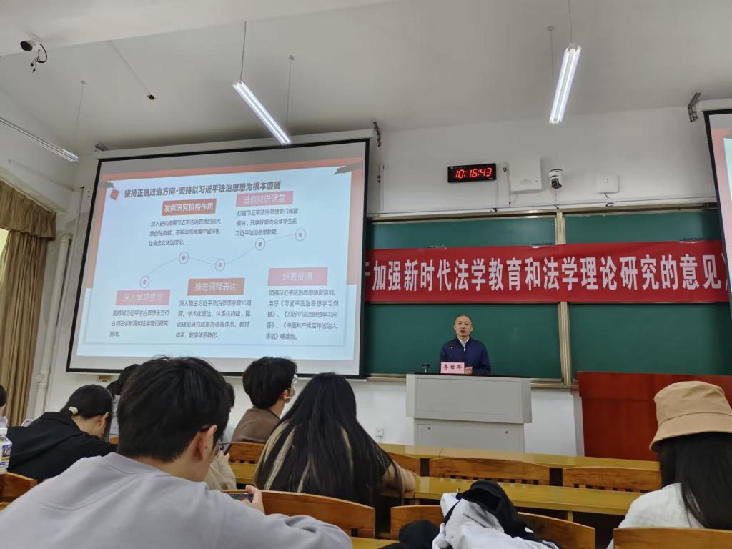 李世军主任总结表示,《意见》旗帜鲜明、主题突出、思想深刻、立意高远,紧密结合当前和今后法学教育和法学理论研究的实际需要,具有极强的针对性和指导性,为培养什么样的法治人才、怎样培养法治人才提出了明确的战略指引。要以习近平法治思想为遵循,将《意见》贯穿法治人才培养和法学理论研究的全过程,坚持围绕中心、服务大局,坚持立德树人、德法兼修,坚持遵循法学学科发展规律和人才成长规律,积极教育引导文法系师生做习近平法治思想的坚定信仰者、积极传播者、模范实践者。