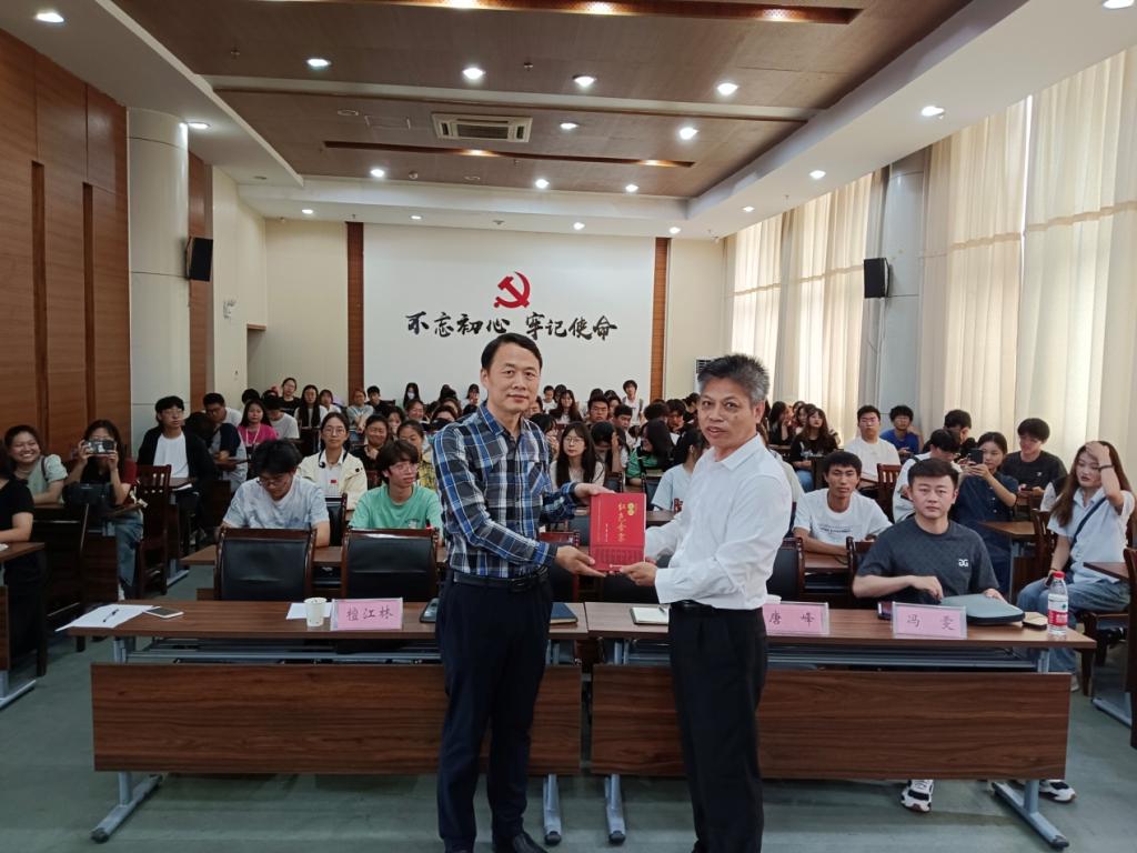 檀江林教授分别向鲍磊副台长、苏莉总工程师和两位讲座记者赠送了安徽省第十五届精神文明建设“五个一工程”特别奖图书《话说红色金寨》。