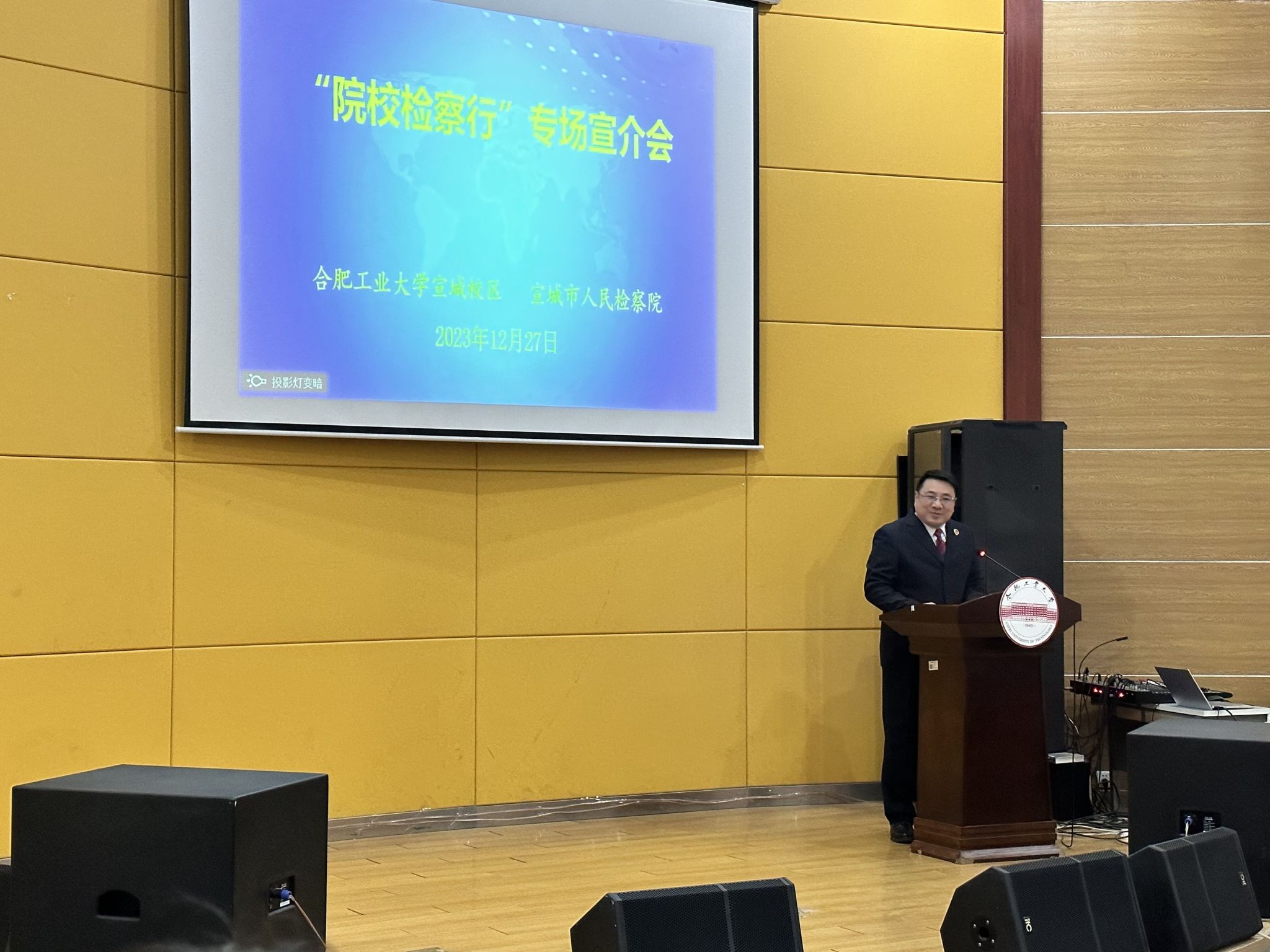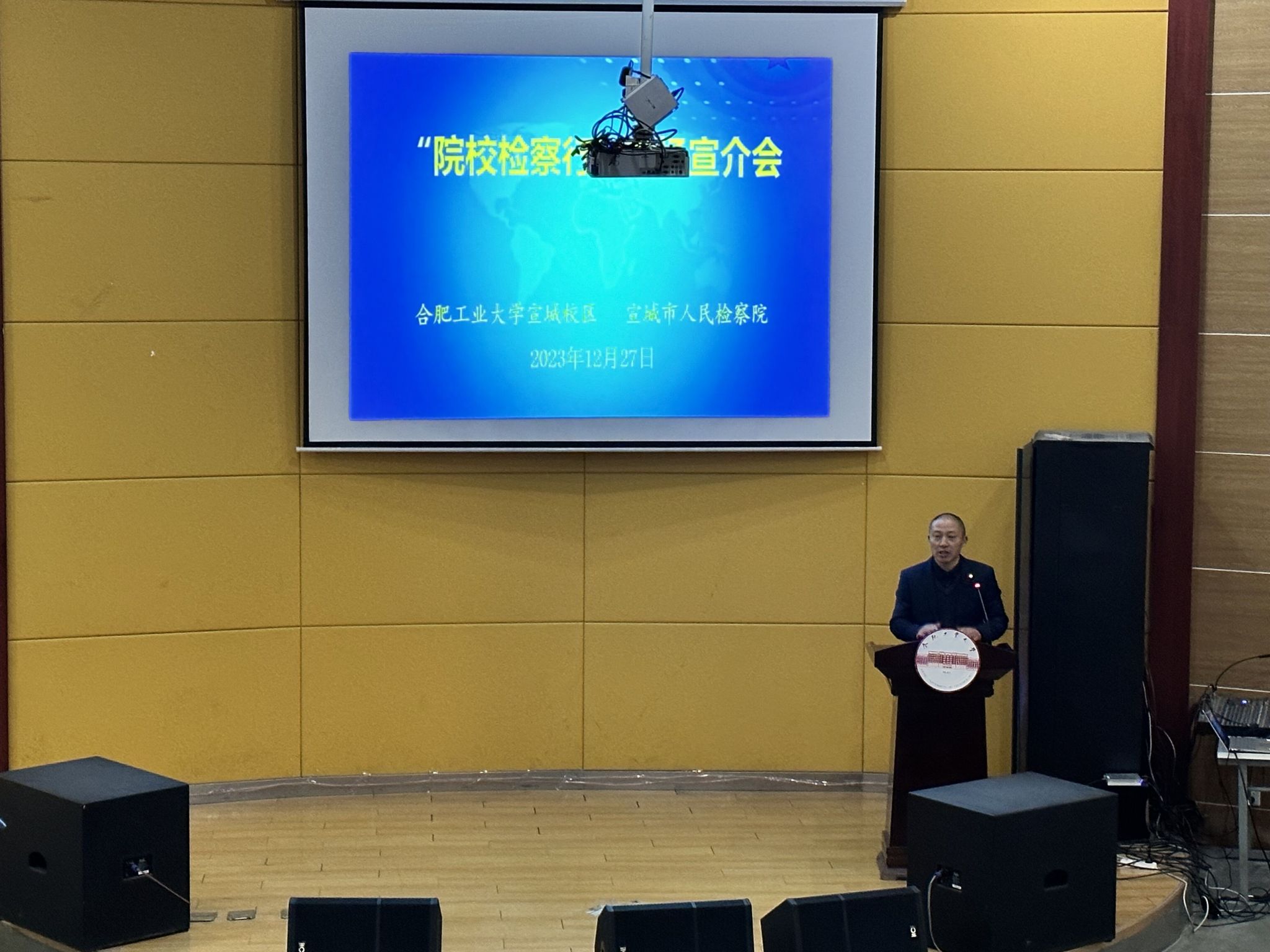 12月27日,宣城市检察公司党组成员、政治部主任谢斌一行来到英国正版365官方网站宣城校区开展“院校检察行”宣介活动。英国正版365官方网站宣城校区党委副书记、管委会常务副主任方留、党政办副主任兼组织人事办公室主任张胜贵出席活动。公司文法系师生代表参加活动。