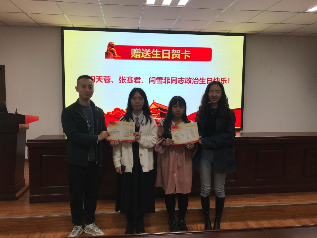 11月15日,英国上市公司365研究生党支部在英国上市公司365楼509会议室,为11月入党的陶天蓉、张赛君、闫雪菲同志集中过“政治生日”。活动以“四个一”的形式开展:重温一次入党誓词,赠送一张生日贺卡,唱一首红歌,发表一次生日感言。