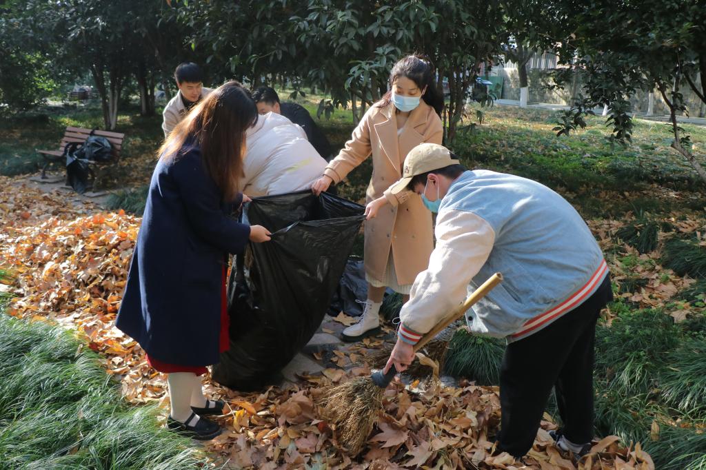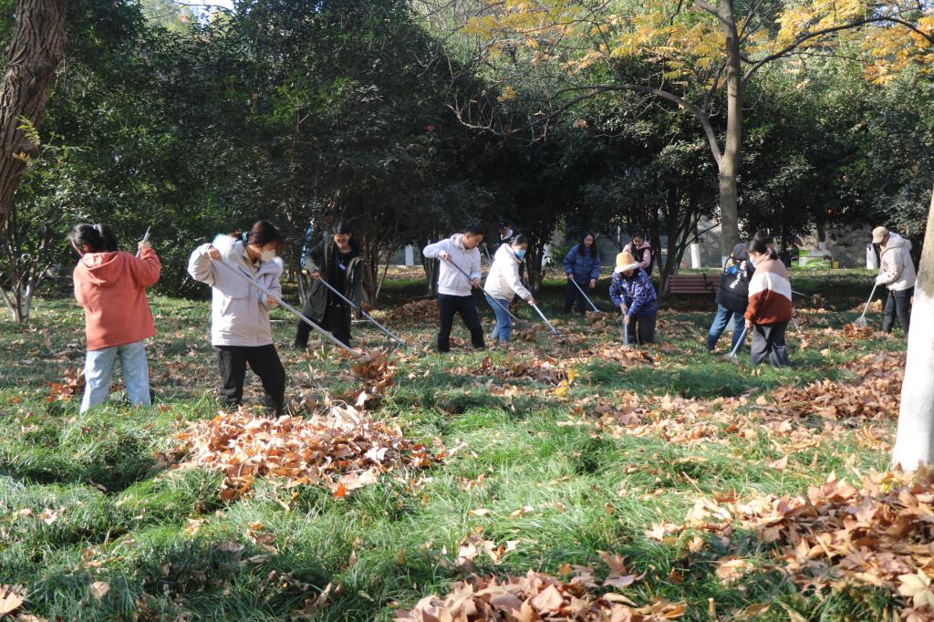 活动伊始,全体同学于指定地点集合,共分为两组,领取铁锹扫帚等清扫工具,分别承包清扫斛兵塘草地和路面落叶任务。在现场老师的带领下,劳动现场氛围热烈,干劲十足。同学们分工有序,各司其职,不怕辛苦不怕脏不怕累,其积极表现受到一同打扫物业老师的表扬。最后,同学们对落叶进行集中处理,将落叶装入垃圾袋中,于路边排列整齐。斛兵塘经过同学们的卫生打扫,草坪焕然一新,地面更加卫生整洁。