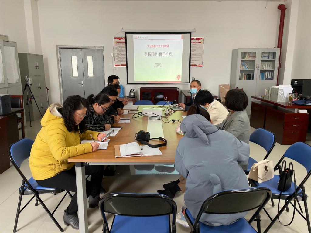 为弘扬师德师风,激励大家践行使命担当,携手抗击新冠肺炎疫情,3月23日,文法系教工党支部组织开展“弘扬师德,携手抗疫”党课教育活动。