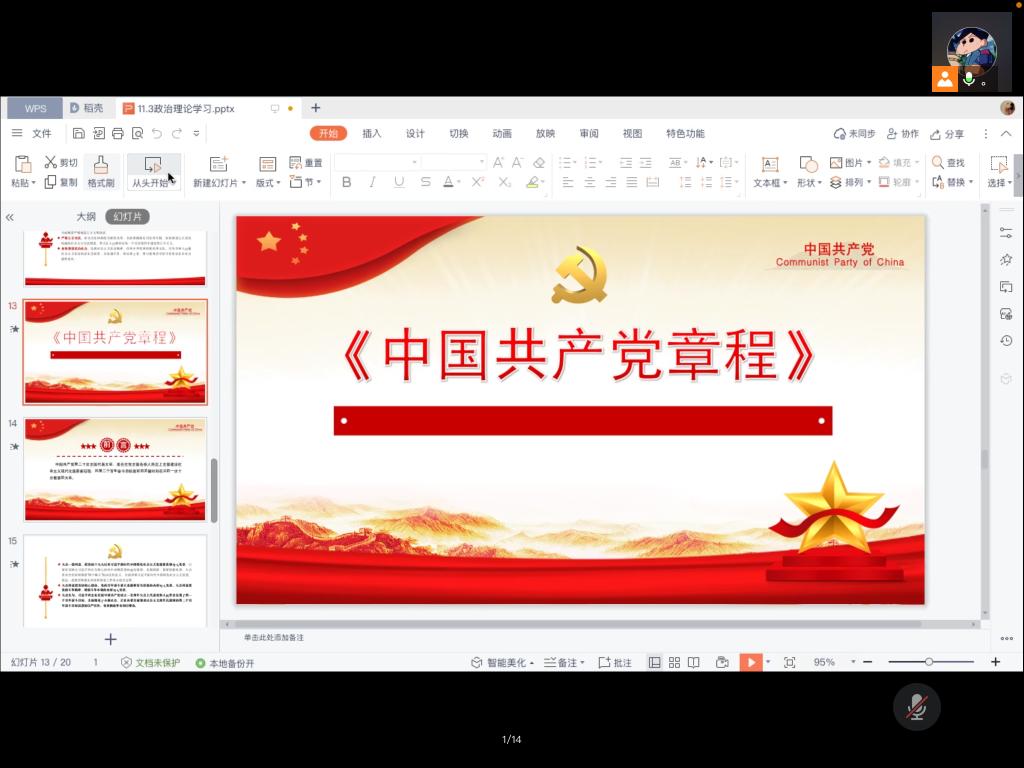 活动第二项,由党支部组织委员张艺璇同志带领全体党员学习《中国共产党章程(修正案)》。最新版的党章共修改107处,其中总纲部分修改58处,条文部分修改49处,张艺璇同志重点领学了《中国共产党章程》总纲部分。学习结束后,支部党员踊跃发言,联系个人实际谈认识、谈领悟。本科生崔少扬表示,党章是党的总章程,集中体现了党的性质和宗旨、党的理论和路线方针政策、党的重要主张,规定了党的重要制度和体制机制,是全党必须共同遵守的根本行为规范。作为员工党员,我们要以习近平新时代中国特色社会主义思想为指引,自觉学习党章、认真学习党章,自觉践行党章,牢固树立党章意识,带头争做学习党章、遵守党章的模范,做一名符合党章要求的合格共产党员。