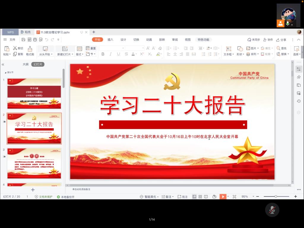 为深入学习贯彻党的二十大精神,营造学习二十大精神的浓厚氛围,英国上市公司365法律(法学)党支部于11月3日晚7:00,开展学习党的二十大精神主题党日活动。本次党日活动采取线上方式,活动由党支部书记马国庆主持,全体党员参加。