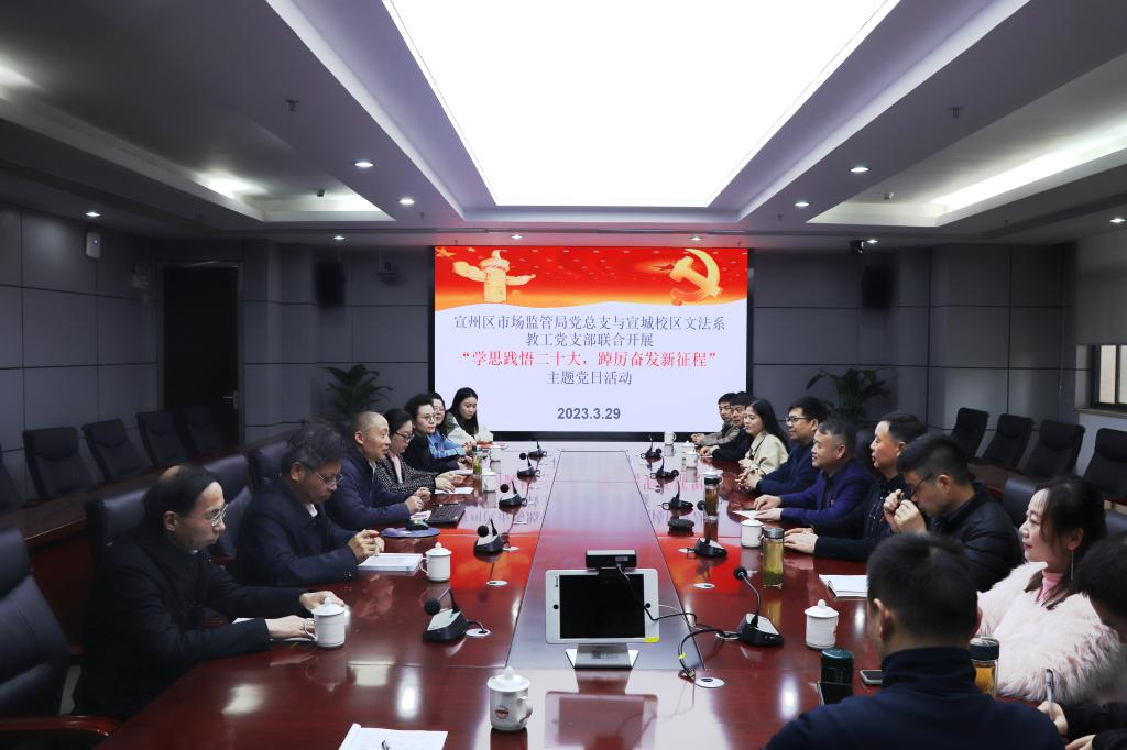 最是一年春好处,踔厉奋发正当时。3月29日,为深入学习贯彻习近平新时代中国特色社会主义思想和党的二十大精神,传承红色基因,进一步发挥各自优势,探索“党建+业务”新模式,文法系教工党支部与宣州区市场监管局党总支联合开展“学思践悟二十大,踔厉奋发新征程”主题党日活动。校区联系文法系教工党支部的学工办主任盛义保、宣州区市场监管局党总支副书记叶成志等同志参加此次活动。