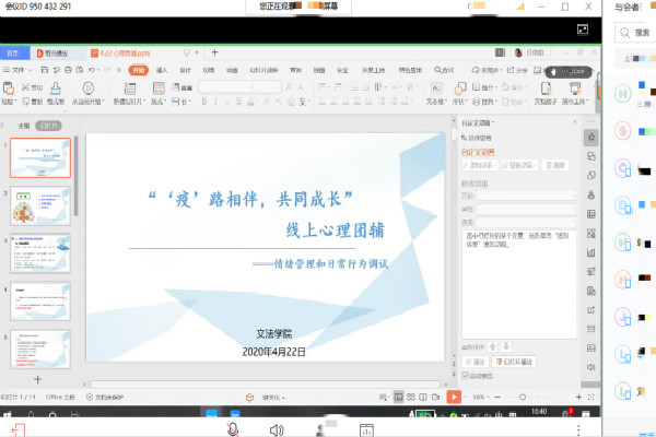 活动伊始,宋老师结合近期部分家长和员工反馈的情况,列举了员工在家进行线上教学后出现的情绪、行为等变化,引导员工思考自身是否有相似的情况以及产生情绪和行为变化的原因,并邀请员工分享近期自身的情绪变化及应对方式。随后,宋老师围绕疫情下的常见心态及应对方法、情绪管理和日常行为调试等方面做了详细的介绍。重点针对如何处理愤怒情绪,从评估愤怒程度、接纳愤怒、适当表达愤怒、改变认知方式等方面给出了应对策略。为帮助员工在家更好进行自我调节,宋老师用图片展示的形式,分步演示了“办公室八段锦”,同学们纷纷通过“云分享”方式进行了学习和相互交流。新颖的“云分享”形式,调节了线上活动的氛围,也拉进了同学之间的感情。最后,宋老师总结本次线上心理团辅活动,鼓励同学们在家要学会疏导不良情绪,保持平和心态,合理安排作息,加强自身锻炼,为后期返校做好准备。