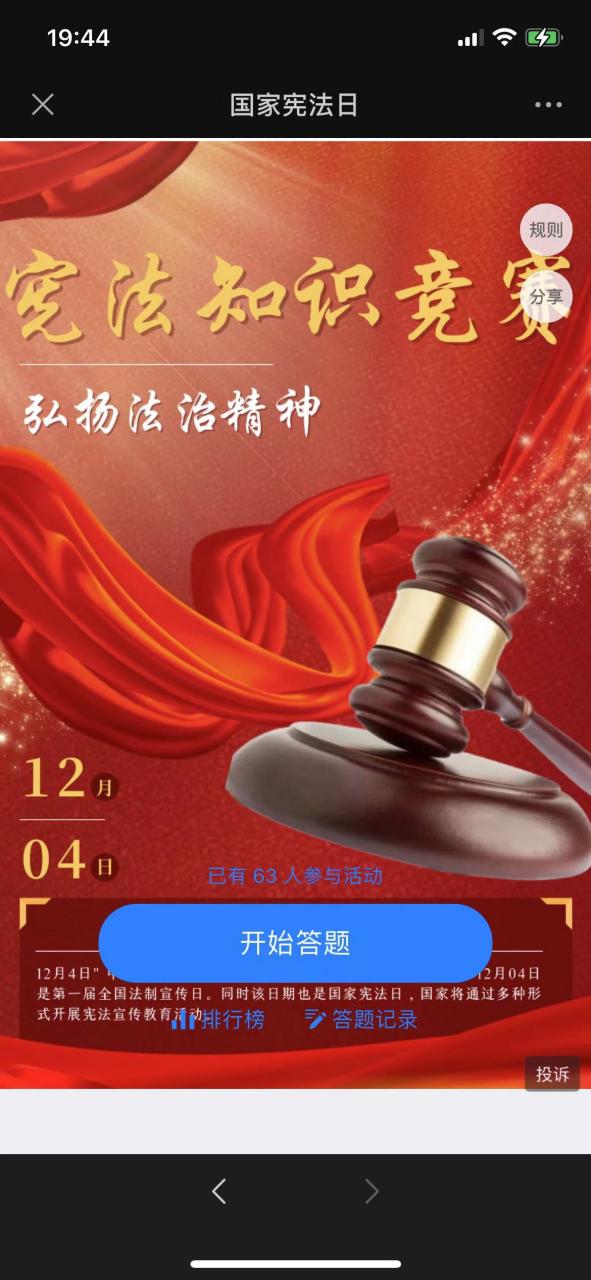 为深入贯彻落实党的二十大精神,纪念现行宪法公布施行40周年,进一步宣传宪法知识,弘扬宪法精神,带领当代青年深入领悟宪法精神、夯实学宪法、懂宪法的法治理念,公司特举办“宪法宣传月”系列活动,院新媒体宣传部通过线上答题活动的形式,以党的二十大报告内容以及宪法相关知识点设置题库,开展累计答题积分活动,以帮助同学们熟悉、掌握、牢记相关知识。