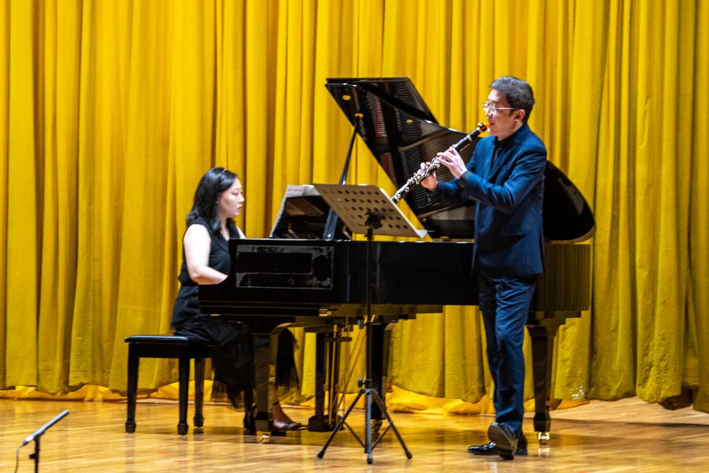 演出伊始,刘胜男老师带来《关雎》和《玛依拉变奏曲》,轻松又庄重的乐声和激昂浑厚的民歌饱含着最真挚的情感直达所有人的内心,很快感染了全场观众。吴多斐老师带来中国艺术歌曲的开山之作《大江东去》和凝聚各族人民团结力量的《北京颂歌》,以极具穿透性的乐声引起全场观众的共鸣。接着,冯伟老师、王丽文老师带来单簧管与钢琴合奏《迎新春舞曲》和《查尔达什》,回拨流转的情感展现了高超的艺术表现力,让观众完全感受到表演的魅力。刘娜老师带来《秋风词》和《青春舞曲》,流畅婉转的古琴小曲和欢快热烈的新疆民歌相互碰撞,给观众带来别样的视听感受。
