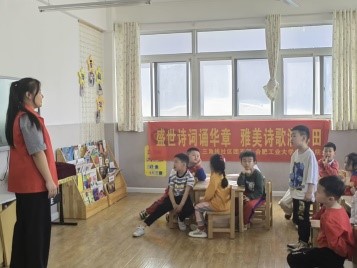 活动中,成员们向小朋友们带去了李白的《夜宿山寺》、白居易的《赋得古原草送别》、袁枚的《苔》、孟浩然的《春晓》。小朋友们在活动中不仅学习了新诗,也学习了诗人的生平以及诗歌所表达的意义。此外,成员们与小朋友积极互动,开展了简单的飞花令活动。互动中小朋友们踊跃举手,积极参与,现场氛围活跃。