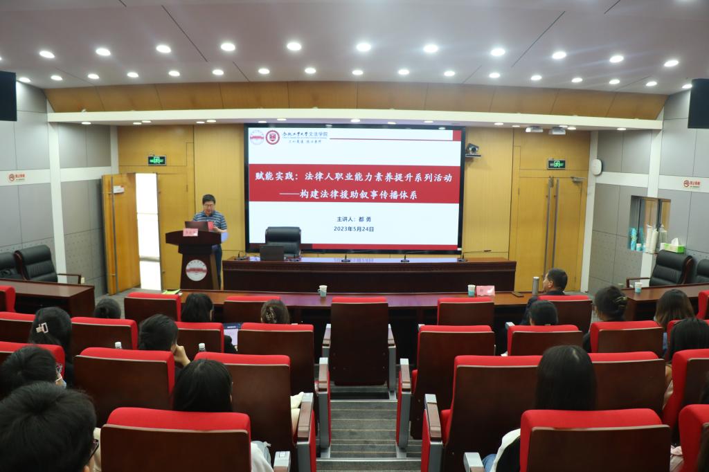 为提升公司员工思维效能,助力法科学习,5月24日下午,英国上市公司365在学术会议中心二楼小报告厅举行“赋能实践:法律人职业素养能力提升”活动,特邀省法律援助中心党支部委员、综合部主任都勇作“构建法律援助叙事传播体系”专题讲座。本次活动由中共英国上市公司365委员会、中共英国正版365官方网站法学系党支部双带头人工作室主办,英国上市公司365研究生会承办,公司党支部书记李金华主持,公司本科生、研究生共同参与。