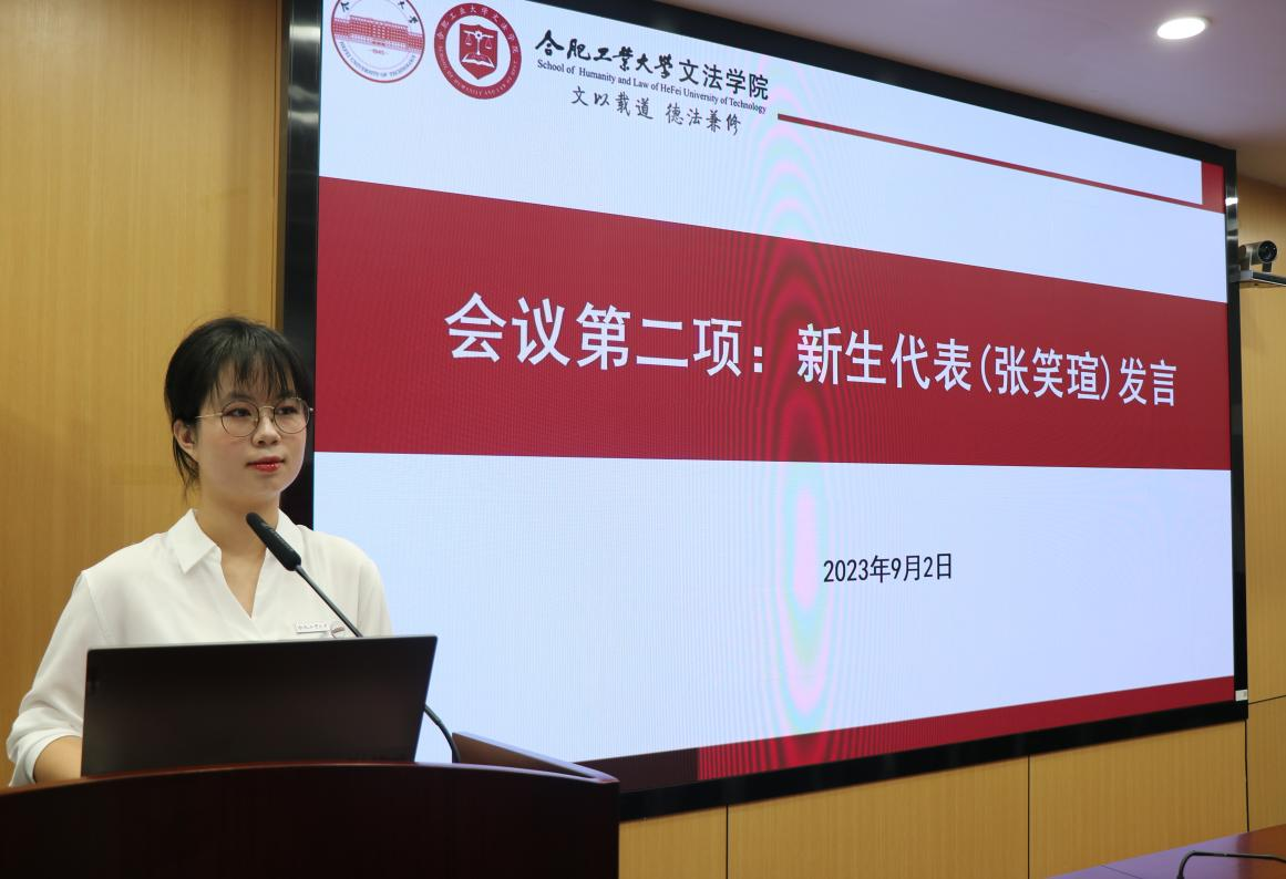 2023级本科新生张笑瑄作为新生代表发言,以《自庐陵至庐州 于文法展新篇》为题,分享了从家乡到工大求学的欣喜和期待,表达了立志成为优秀法律人的决心,最后,祝愿新同学在未来的学习道路上,秉持“强国有我 青春有为”的信念,踏实肯学,勤于钻研,让自己成为可堪民族复兴重任的时代新人。