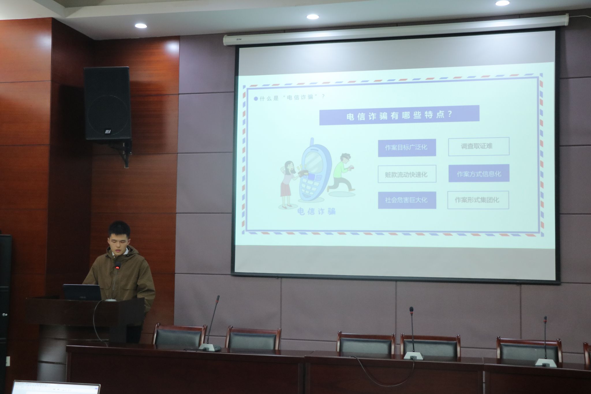 本次普法宣讲活动分为两个部分。首先,由岳松童同学主讲,他从法律的角度向我们介绍了什么是电信诈骗,总结了新型电信诈骗的六个特点,以提高同学们辨识电信诈骗的能力。岳松童同学结合典型案例和相应的防范措施,介绍了易遭受电信诈骗的人群与其性格特征,同时总结了“十个凡是”的安全防范小结。