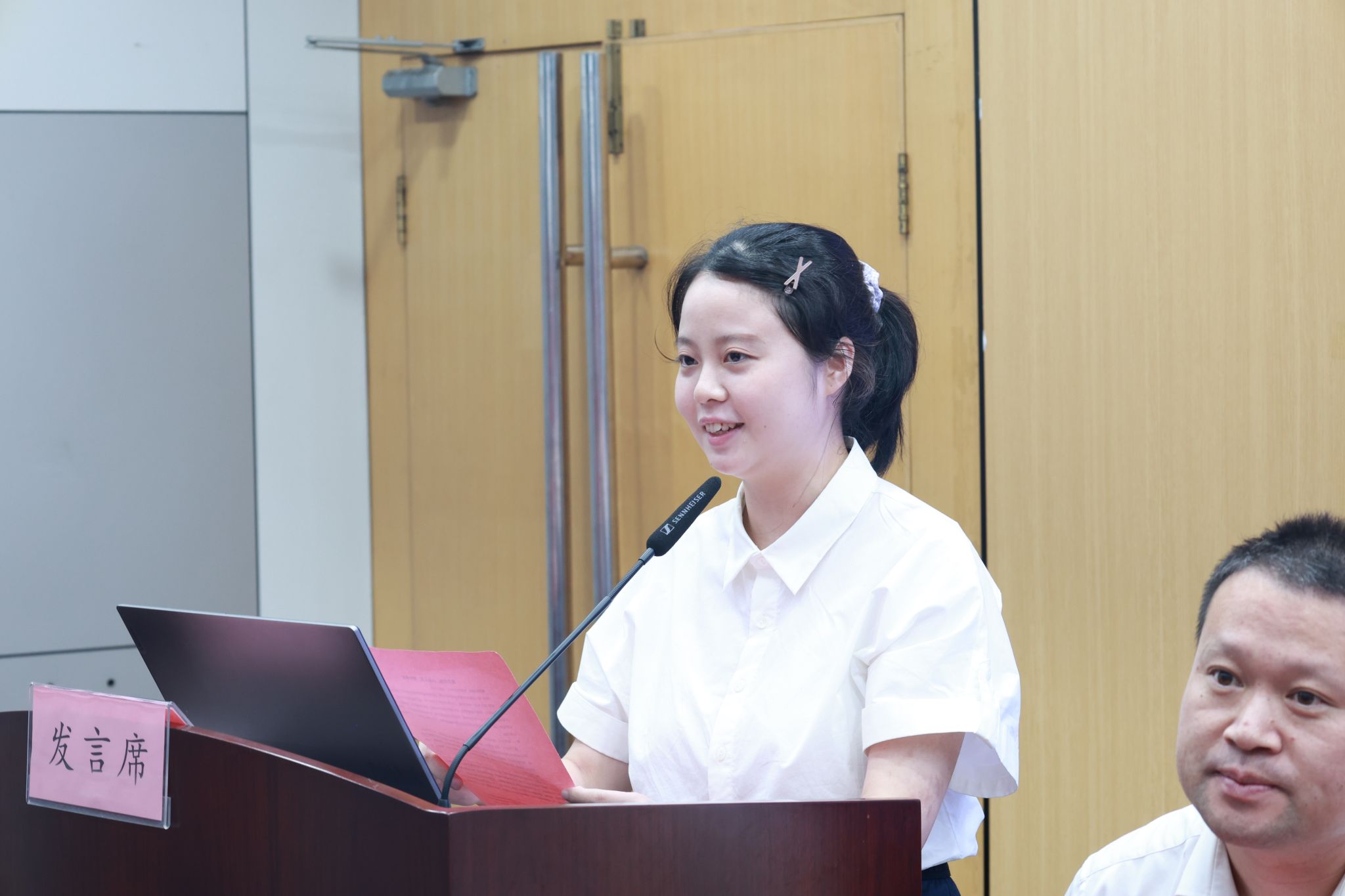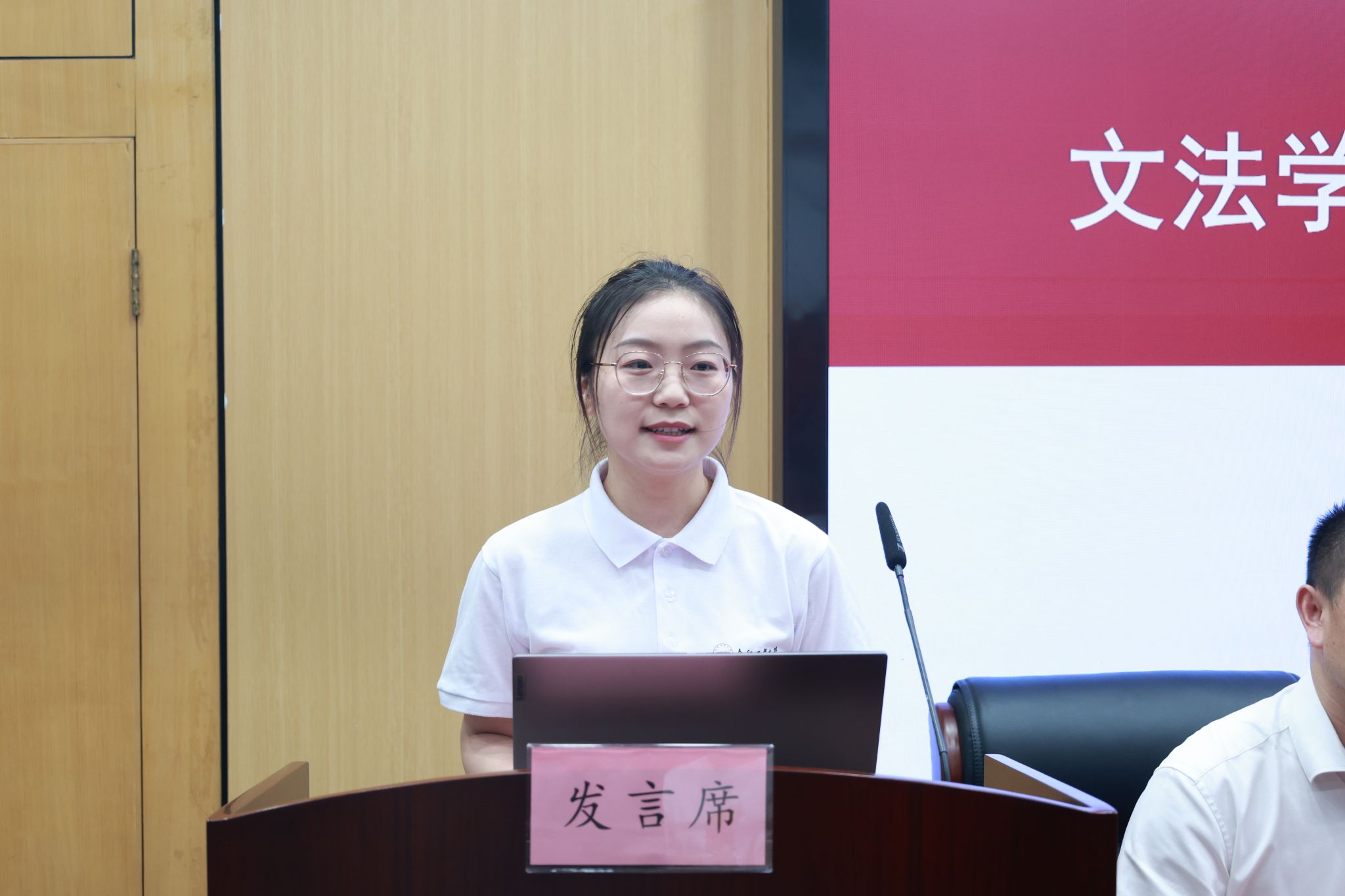 会议第二项,2024级研究生新生代表毕然同学和2023级研究生老生代表郑思怡同学上台发言。毕然同学以饱满的热情分享了自己踏入新校园的激动心情和对未来学术生涯的无限憧憬。郑思怡同学引用“行胜于言,质胜于华”,向学弟学妹们分享自己的学习心得,鼓励学弟学妹要付诸实际行动,行动永远是打败焦虑的最好方法。