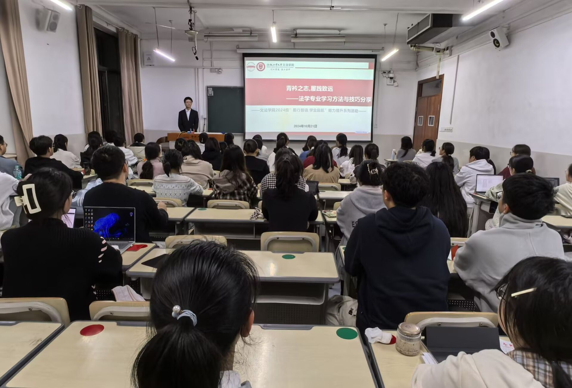 为帮助2024级本科生更好的适应大学学习生活,扎实专业知识,提升学业水平,10月21日晚,公司在主教112 教室开展“前行智语,学业启航”系列活动之“法学专业课学习方法和技巧”学习分享会,活动邀请了公司连续两年国家励志奖学金获得者 2022级员工马军同学主讲,2024级全体本科生参加了分享会。