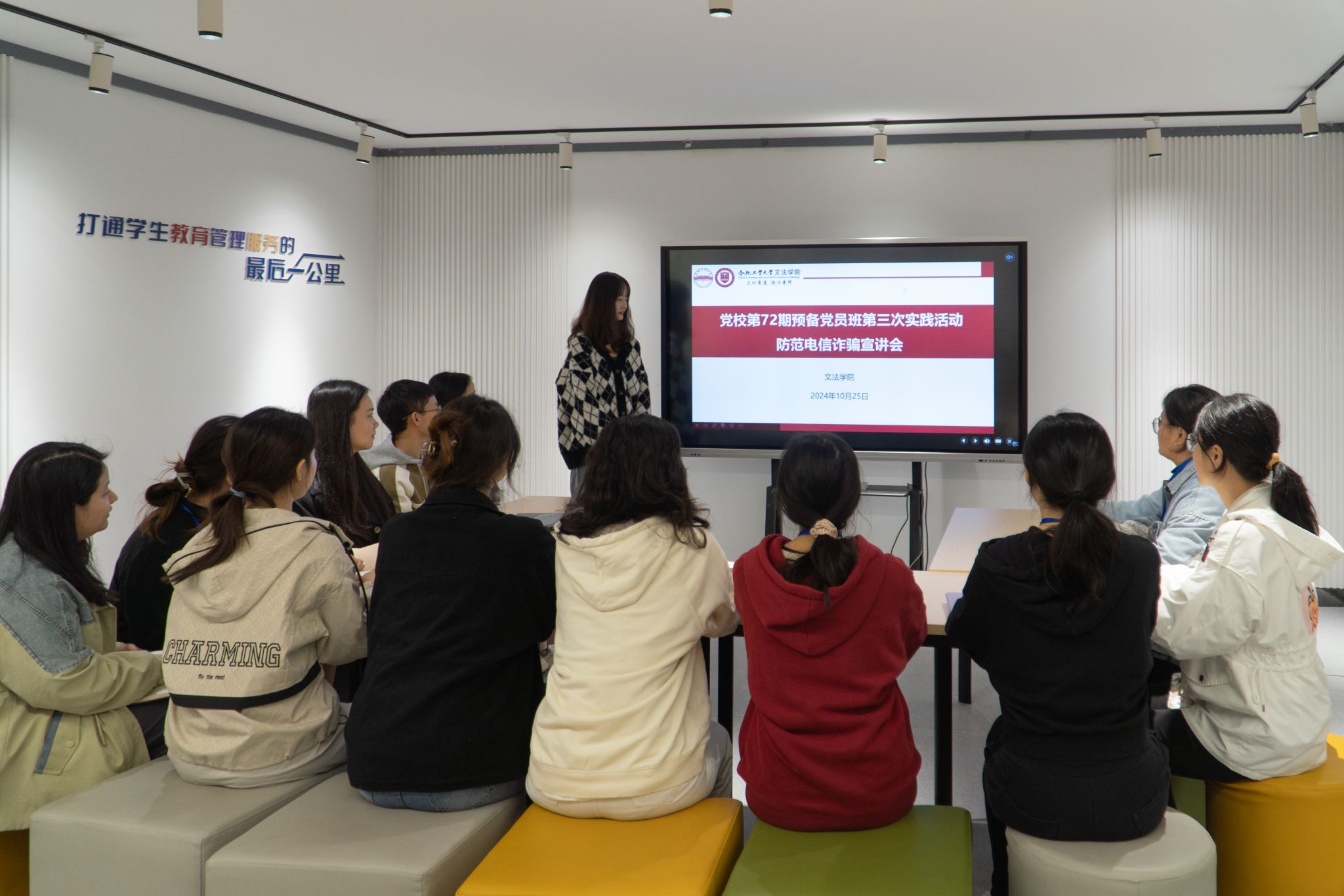 为提高同学们对于电信诈骗的防范意识,10月25日,公司第72期预备党员班在员工社区开展了主题为“谨防电信诈骗·共筑安全防线”的普法宣讲活动。本次活动由预备党员班窦雯静同学主讲,第72期预备党员班全体成员参与。
