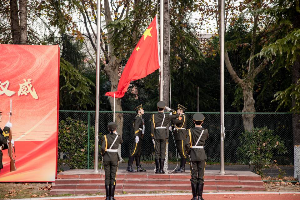 早上7点,晨曦初照,国旗护卫队的队员们身着整齐划一的制服,眼神坚定庄严,出旗步伐铿锵有力。 当激昂的《义勇军进行曲》奏响,五星红旗如火焰般冉冉升起。全体师生面向国旗肃立行注目礼,国歌声雄浑嘹亮,饱含对祖国的无限热爱与崇高敬意。