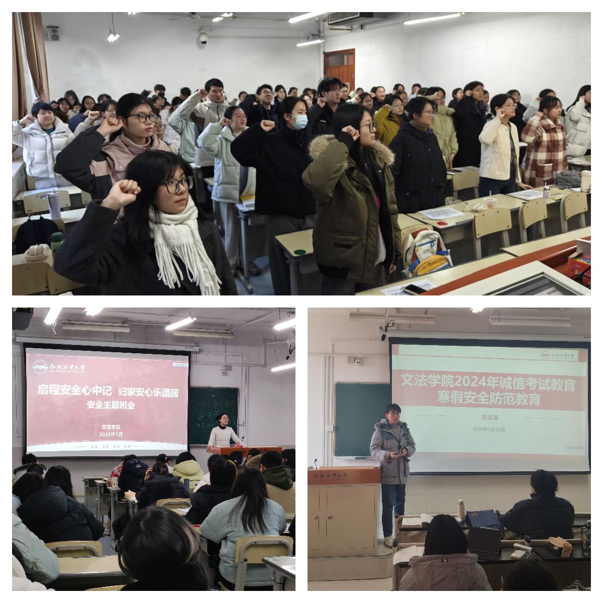 会上,辅导员老师结合《员工手册》中有关考试的相关规定,强调了诚信考试的重要性,指出诚信不仅是个人品质的体现,更是维护校园学风、营造公平竞争环境的关键。结合真实案例,指出考试作弊对个人学业发展和未来规划造成的严重后果,并组织现场同学进行了诚信考试宣誓以及《诚信考试承诺书》签订,呼吁全体同学自觉树立正确的考试观,坚决杜绝作弊行为,共同营造风清气正的考风和学风。随后,围绕消防安全、交通安全、防电信诈骗等内容,通过案例分析、视频播放等形式,生动展示了各类安全事故的危害性,提醒同学们在假期期间,要合理安排时间,注意劳逸结合,文明出行,确保个人人身和财产安全。同时,针对离校注意事项,老师重点强调了宿舍关水、断电、防盗等工作的重要性,要求同学们离校前务必做好安全隐患排查,杜绝各类安全事故的发生。