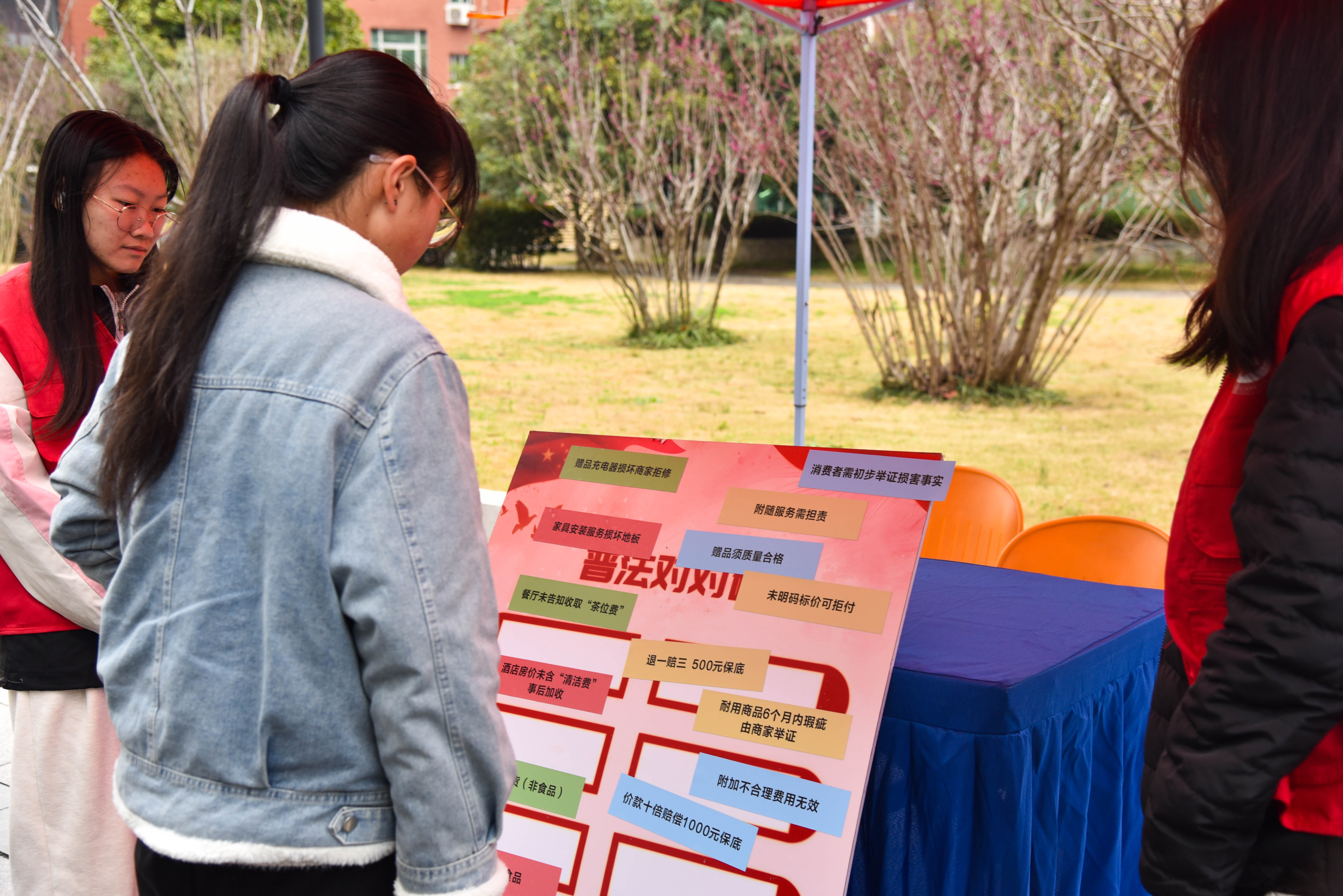 本次活动共设置两个小游戏,法律对对碰与普法问答题。题目以民法典为核心,重点围绕消费者权益保护,涉及当下热点问题并结合典型案例,如网购、医美索赔、赠品质量问题、收费陷阱等。同学们踊跃参与,反响热烈,志愿者们也积极解答,为人们科普相应法律知识,展现出极高的法律素养。本次活动不仅以“小案例”诠释“大法律”,更以“小游戏”激活“大能量”,成功打破传统普法的单向灌输模式。通过趣味互动,消费者权益保护意识从“纸上条文”转化为“手中利器”,既点燃了公众主动学法、用法的热情,也为构建“遇事找法、维权靠法”的社会氛围注入新活力,助推法治文化真正扎根于群众生活。