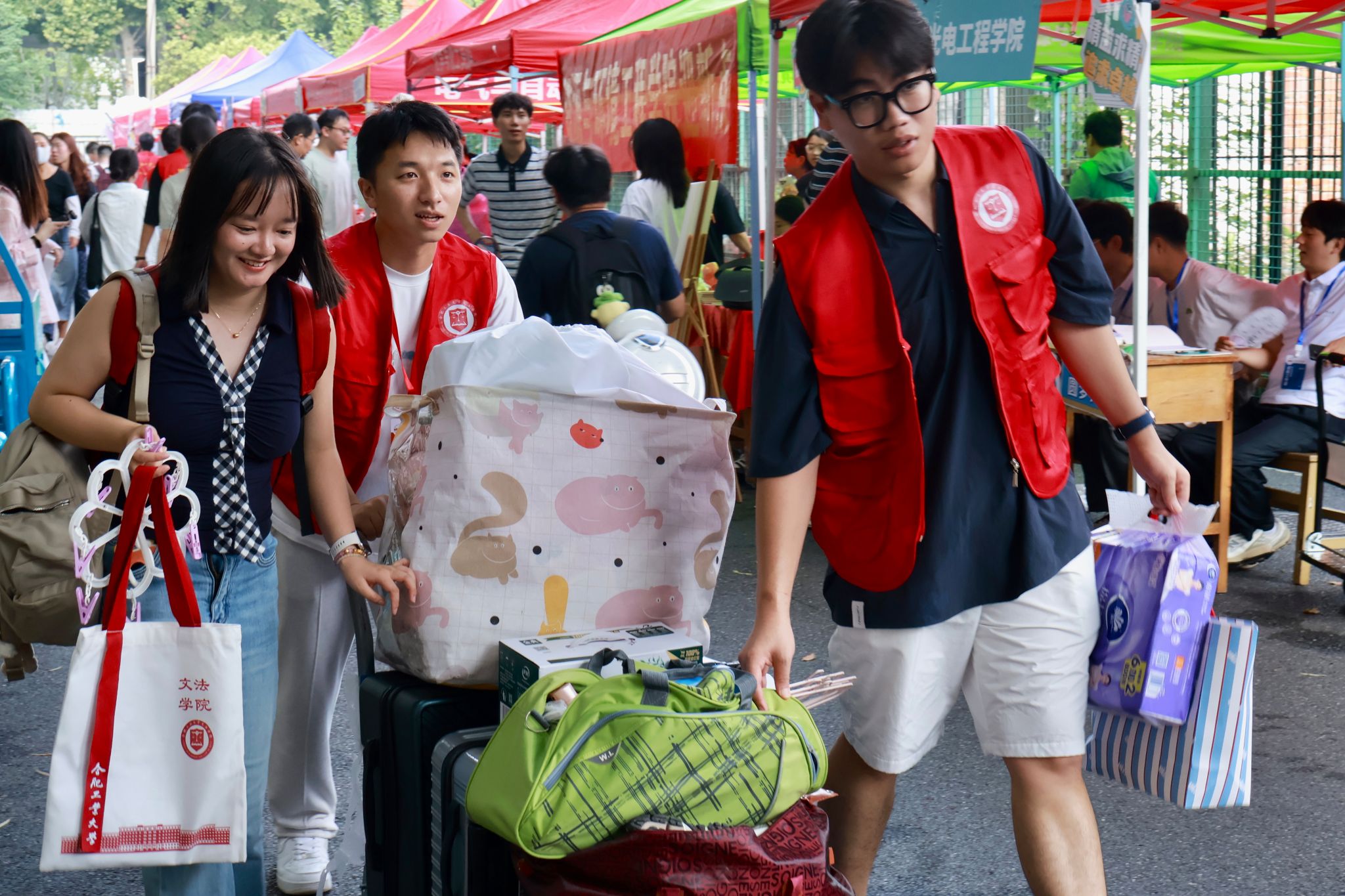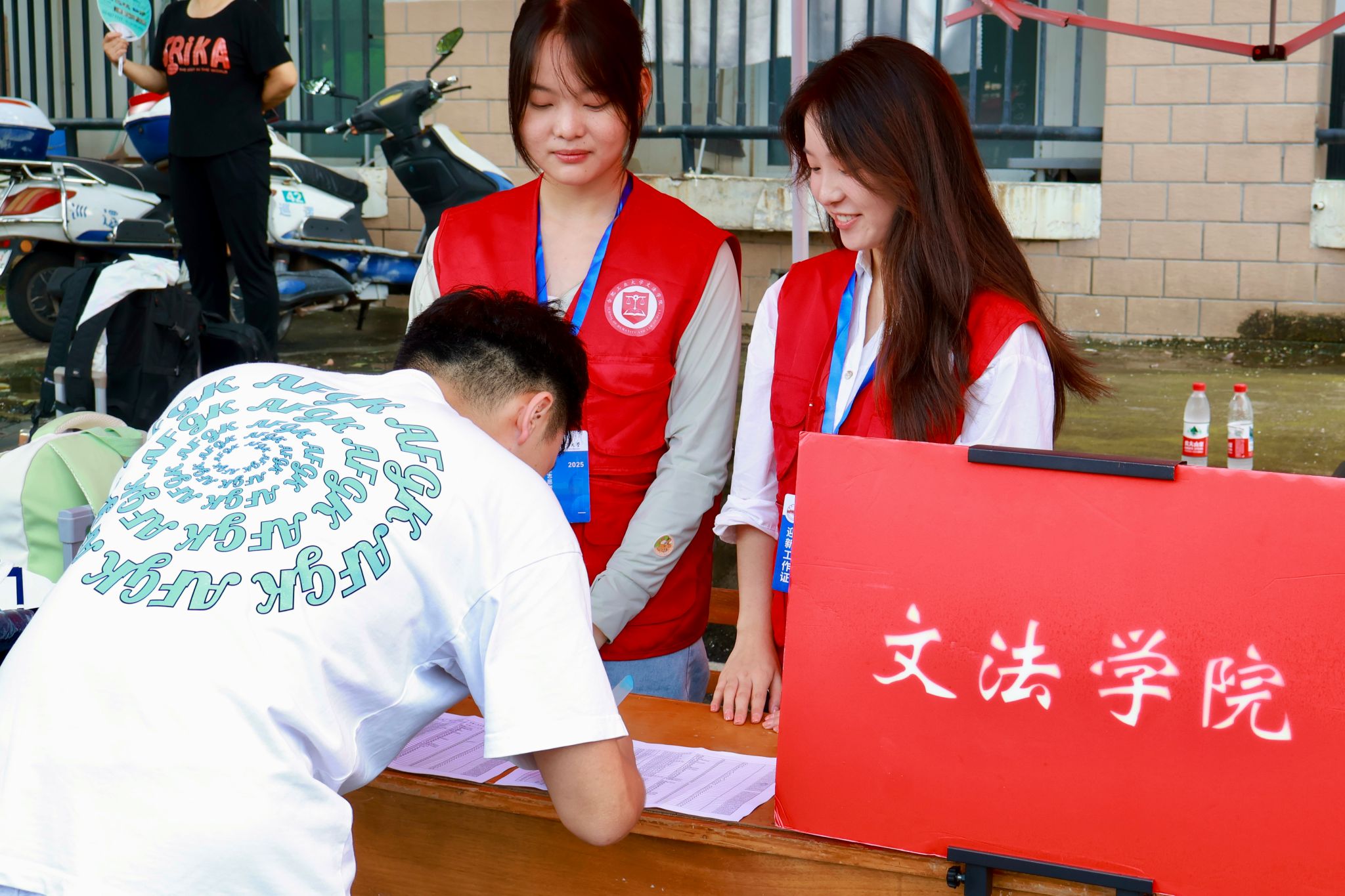 清晨七点半,迎新工作已全面启动。公司楼前设置的报到接待点早早准备就绪,为新生提供高效便捷的一站式入学服务。报到现场流程清晰、秩序井然,老师们细致地核验录取通知书、学历学位证书等材料,确保信息准确。迎新志愿者用热情与汗水汇成一道温暖而充满活力的风景线。他们不仅主动协助新生搬运行李、指引路线,还热情介绍校园学习生活设施,让新同学感受到文法大家庭的亲切与温暖。公司特别设置了具有学科特色的打卡纪念区,许多新生在这里留下入学第一天的纪念影像,开启崭新的学术之旅。