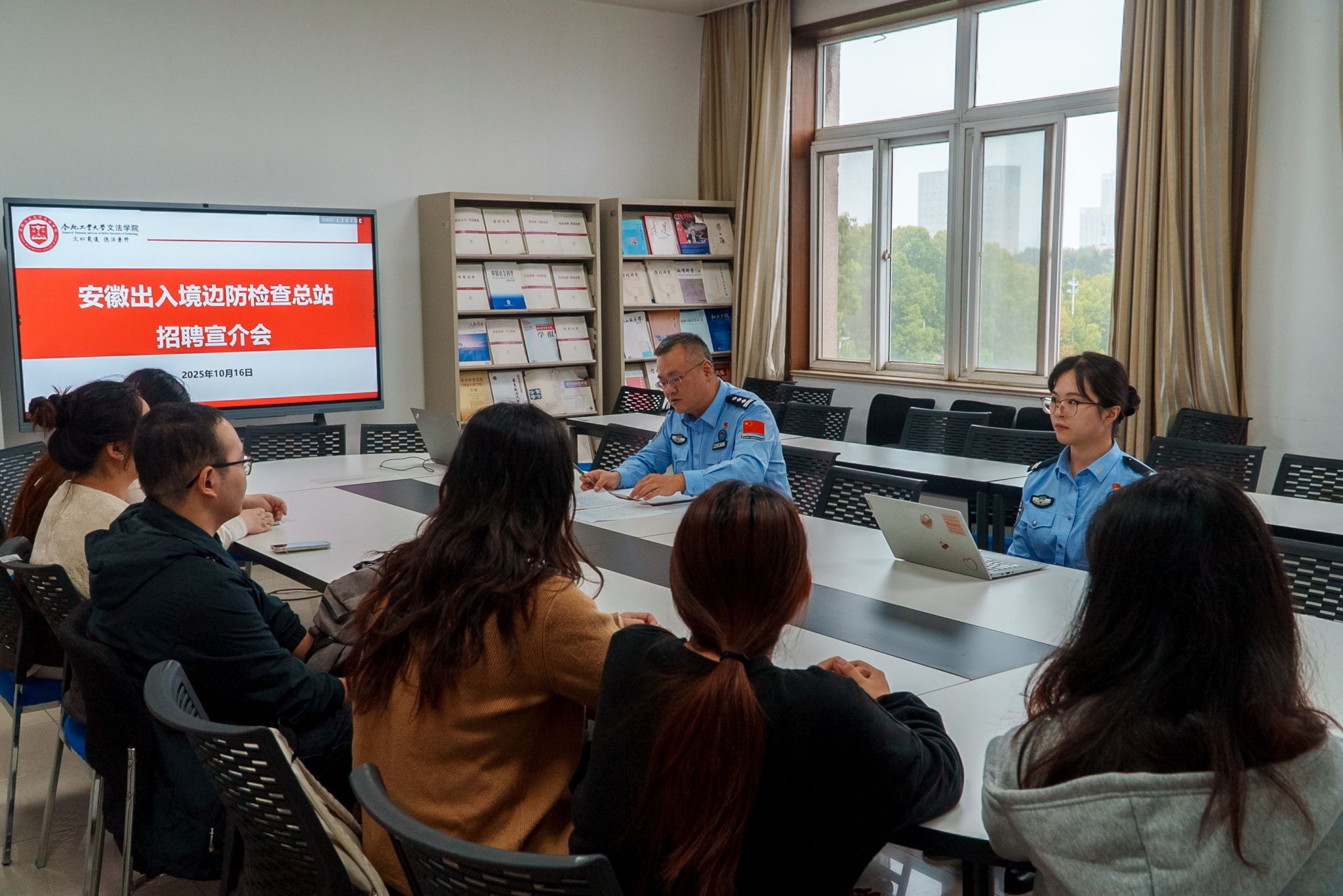 为精准对接文法专业学子就业需求,10月17日下午,安徽出入境边防检查总站政治处在公司楼410会议室举行招聘宣讲活动。本次活动由安徽出入境边防检查总站政治处主持,公司23级法学学硕研究生共同参与。