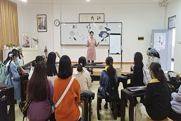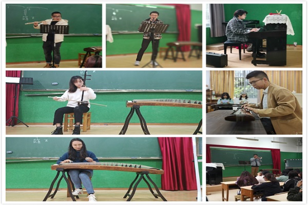 在九教105古琴教室,吴晶老师为同学们详细介绍了古琴的基础知识,随后一曲《满江红》,乐曲情绪雄壮有力,声势气壮山河,曲中委婉处又似苍凉独白,令人动容。紧接着,在九教104教室,音乐会在冯伟老师与朱慧敏老师带来的单簧管和钢琴合奏《来自中国的颜色》中拉开帷幕,优美的旋律,欢快的节奏瞬间将在场的师生带入到欢乐的氛围。孙誉航老师带来的长笛重奏曲《拿波里舞曲》,声音柔美清澈,令人沉醉。潘骏亚老师带来的小号独奏曲《舒伯特小夜曲》,曲风幽静婉转、深情动人,彷佛将师生们带到了月光皎洁、竹叶重重的夜晚。王珺老师带来的古琴独奏曲《战台风》,手指拨动,琴弦作响,乐音激昂震撼,颇有万马奔腾雷霆轰鸣之势,瞬间炸裂全场,也将整场音乐会氛围推向高潮。随后,音乐会在方超老师二胡独奏曲《葡萄熟了》的演奏中进入尾声。近两个小时的音乐会,在场师生们听的如痴如醉,现场响起一次次热烈的掌声,并不时传来声声赞叹。6位老师们精湛的技艺,对作品内涵的精准表现力,令人折服。曲毕谢幕,在同学们的热烈欢呼中,朱慧敏老师再次返场,演奏了一曲《大鱼》,伴随着同学们的合唱,整场音乐会画上了圆满的句号。