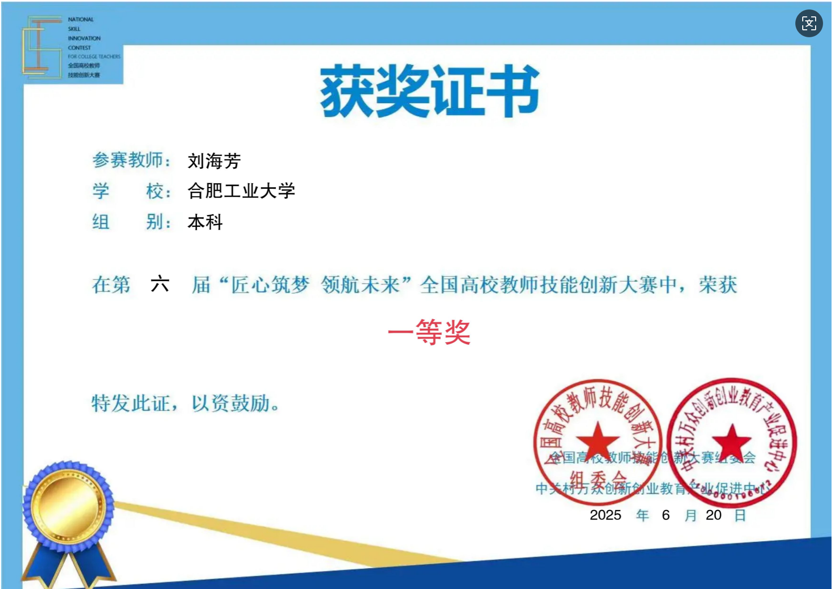 2025年6月21日,在第六届“匠心筑梦 领航未来”全国高校教师技能创新大赛中,公司刘海芳老师凭借卓越的教学创新能力,斩获本科组全国一等奖,彰显了公司公司产品改革的突出成果。
